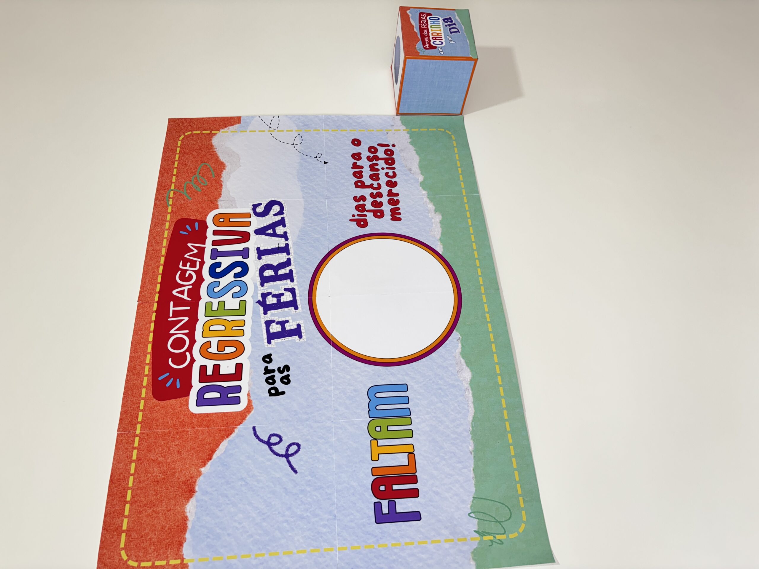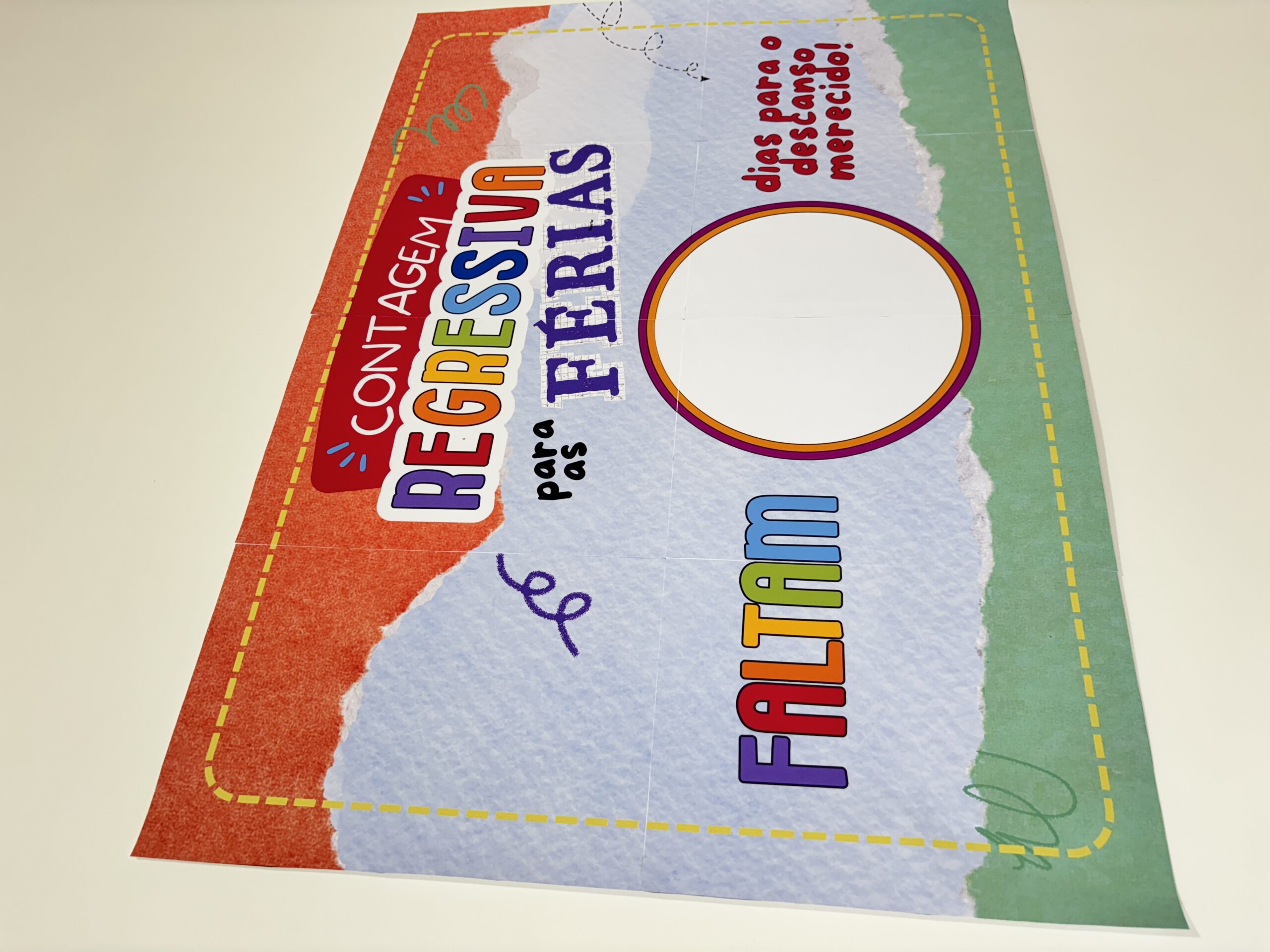• Espaço central para escrever e apagar, diariamente, o número de dias que faltam (use fita adesiva transparente ou papel contact!)