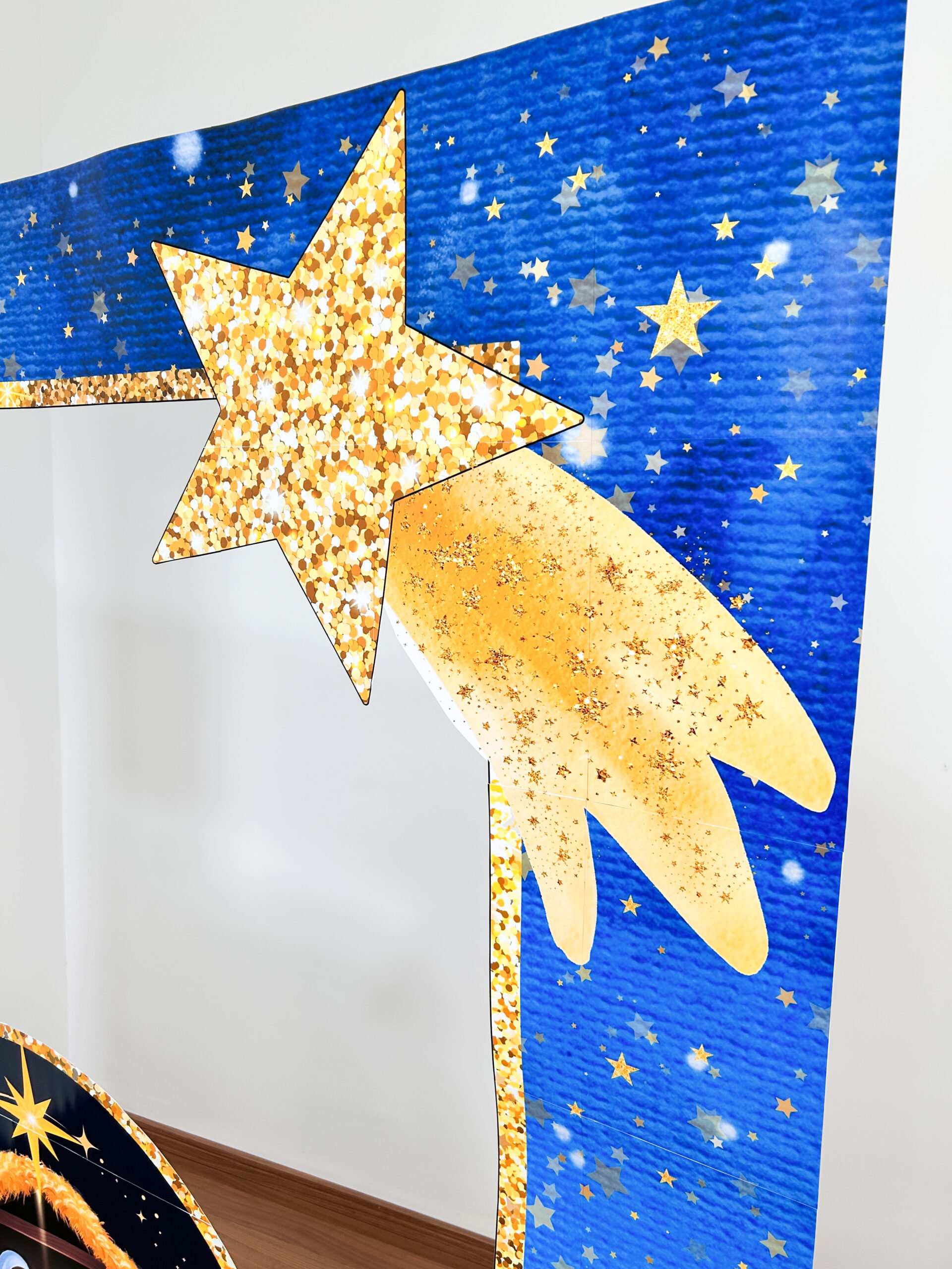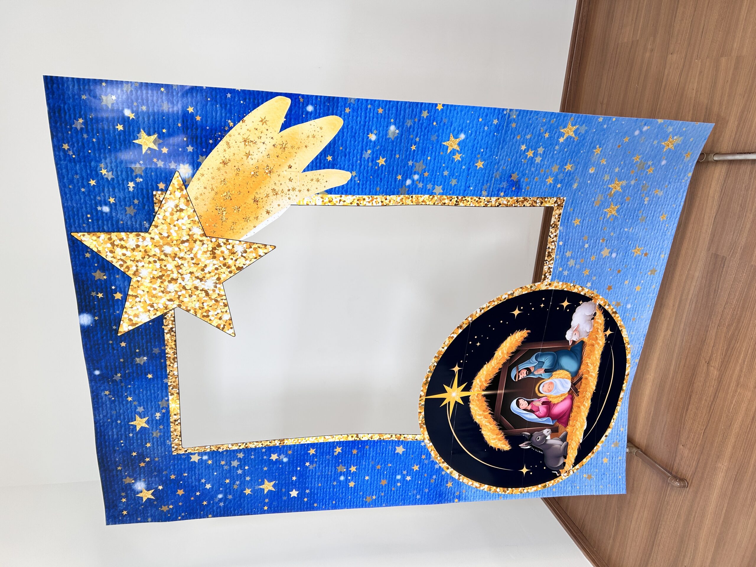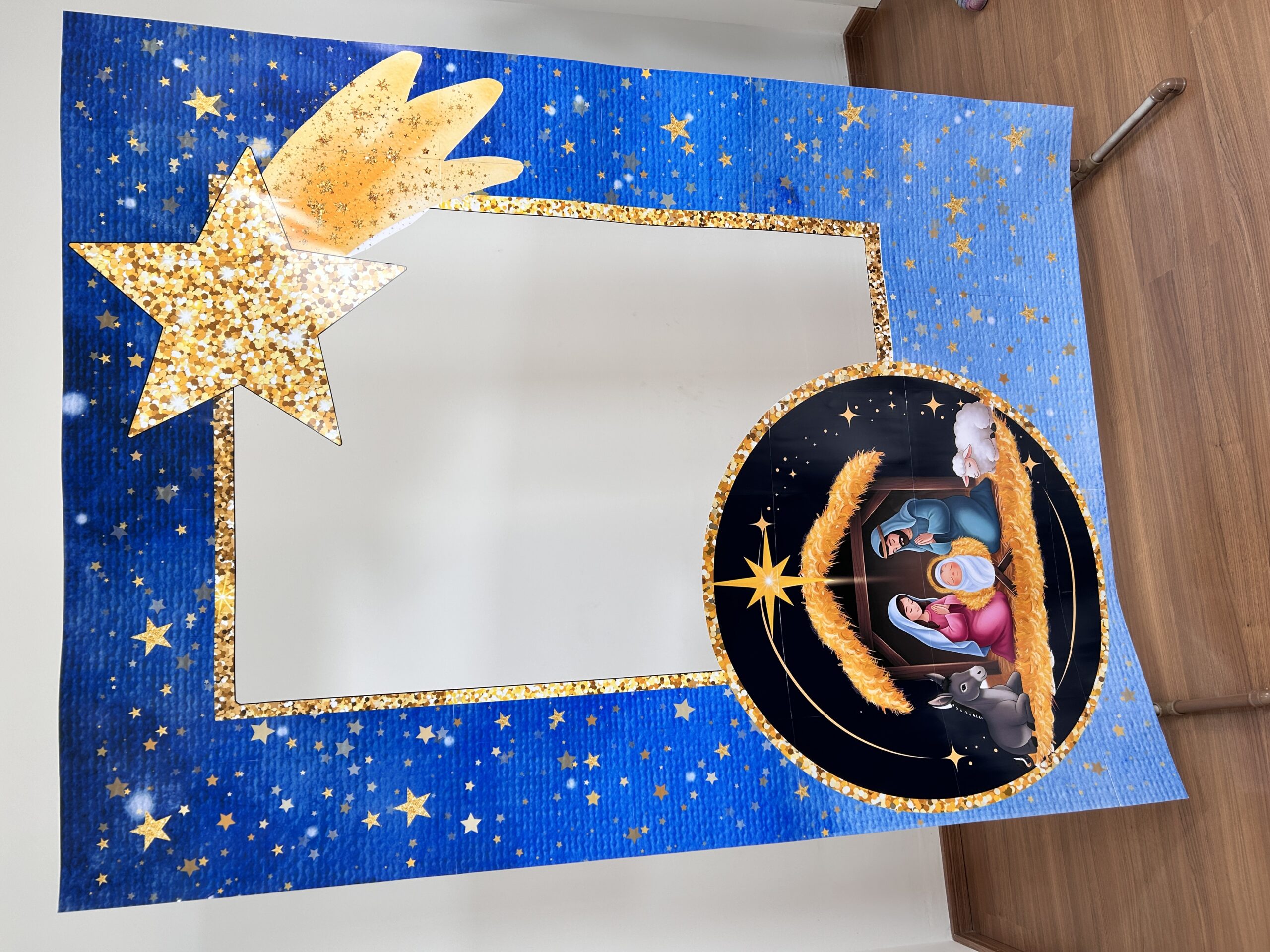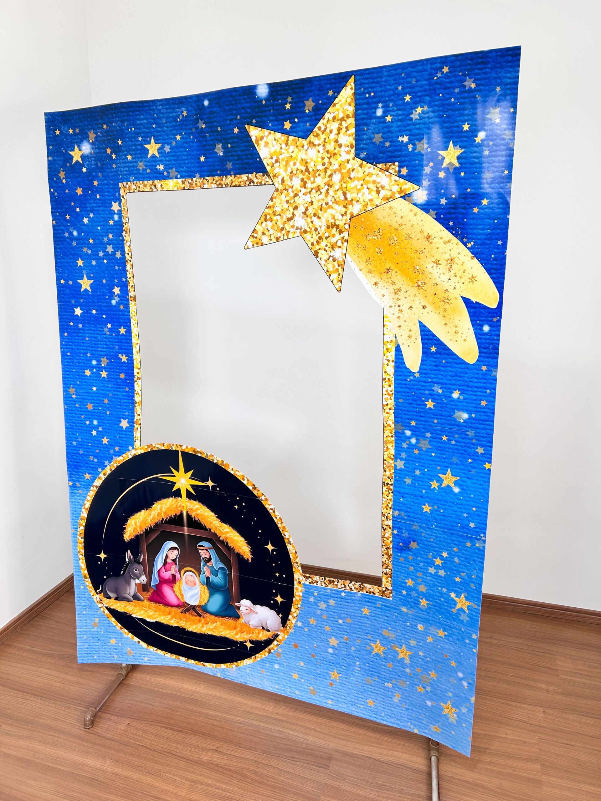 Este painel natalino foi feito com carinho, com fundo azul estrelado, estrela guia e o presépio que ilumina qualquer ambiente.